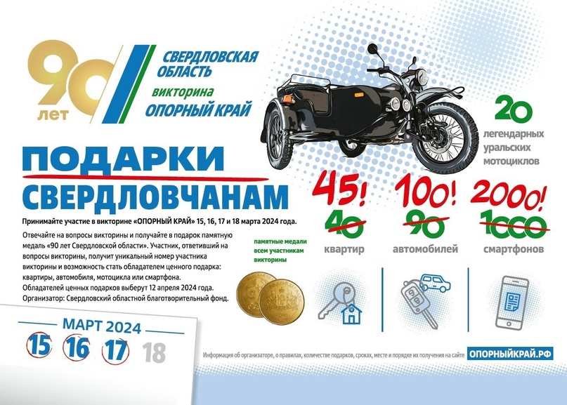 За участие в викторине «ОПОРНЫЙ КРАЙ» свердловчане получат подарок – памятную медаль, посвященную 90-летию Свердловской области.
