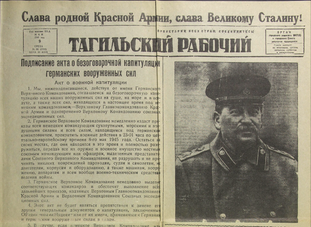 И если о нападении Германии на СССР газета «Тагильский рабочий» сообщила лишь спустя два дня с начала войны, то о её завершении многотиражка без промедлений протрубит 9 мая. В самом долгожданном выпуске №90 публикуют акт о капитуляции, решение Совнаркома считать 9 мая «днем всенародного торжества – ПРАЗДНИКОМ ПОБЕДЫ». Эту среду власти объявили нерабочей. О том, как Нижний Тагил встретил сообщение о Победе, говорится лишь в небольшой заметке «Праздник народный»: