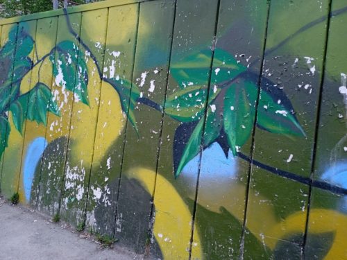 Сейчас эта стена выглядит как облезлый забор в захудалой деревне. Мало того, что она вся облупилась, но по низу стены уже и трава кочками растет. И это на центральной улице города, у Дворца культуры.